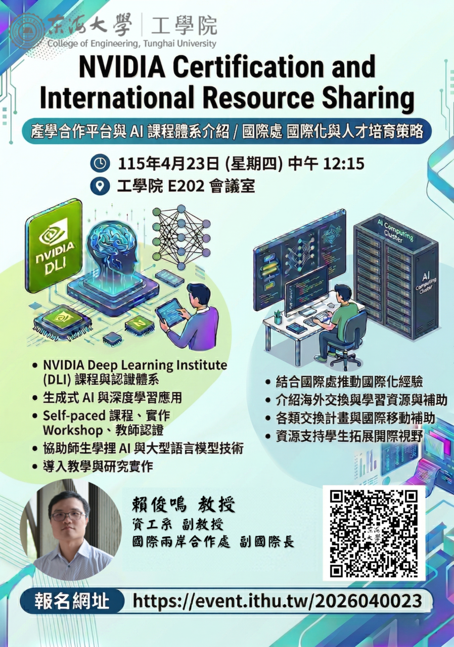 隨著人工智慧技術的快速發展,產學合作平台逐漸成為高等教育推動 AI 教學與人才培育的重要資源。本次分享將介紹 NVIDIA Deep Learning Institute (DLI) 的認證與課程體系,並說明其在生成式 AI 與深度學習教學上的應用。NVIDIA DLI 提供包含 self-paced 課程、實作導向 workshop 以及教師認證制度,使教師與學生能透過實際操作掌握 AI 與大型語言模型相關技術,並協助教師將最新 AI 技術導入課堂教學與研究實作。